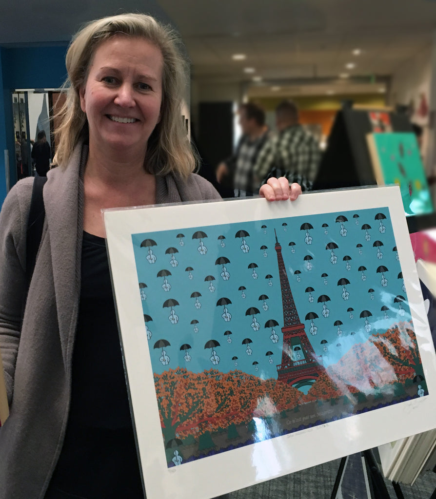 One of the reasons I bought San Francisco Sister is because it made me feel so good. I love the whimsy and imagination of the little guys floating to the ground with umbrellas, around a place as packed with fantasy as the Eiffel Tower! Aren't we all finding our way to feeling grounded, at a variety of rates? So often we feel ourselves floating in the universe. Hopefully, my clients who see this in my psychotherapy waiting room will feel that they have one of these little umbrellas, and that they are being gently eased back to earth.
