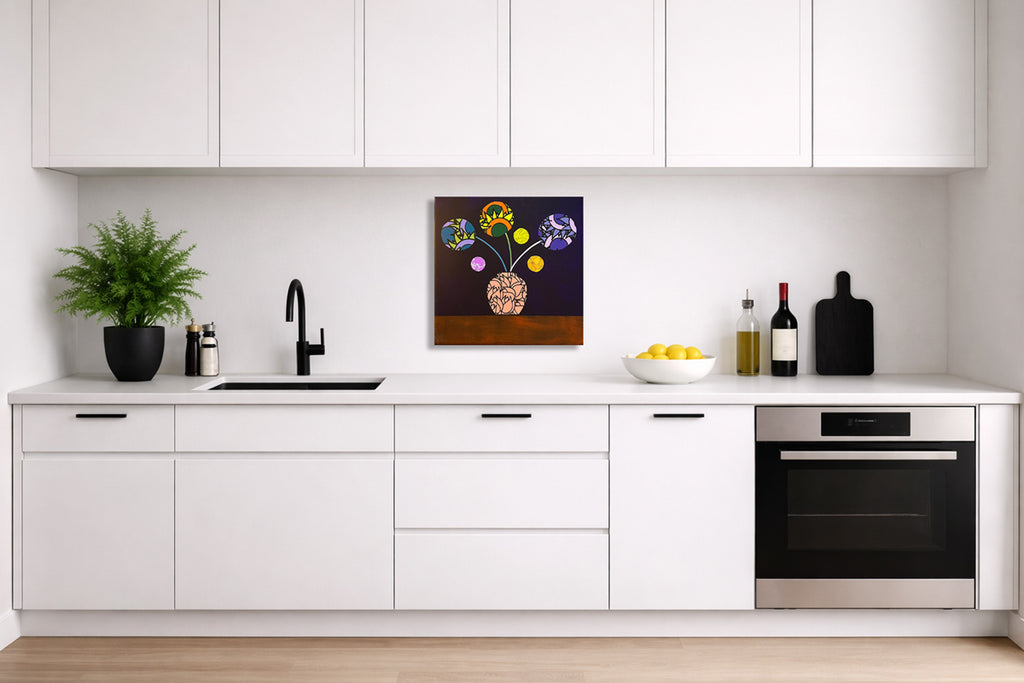 All of my original artworks are mixed media and resin on wood panel and ready to hang. My process includes first applying solid or transparent color-washes to custom made wood panels. I then hand cut archival paper featuring flowers from paintings and illustrations that I've created over the past 20 years. I use the resulting shapes to create surreal and colorful floral compositions. This gives the illusion of flowers within flowers or a garden within a garden. The poured resin coating provides UV protection and really makes the colors pop. I hope you enjoy this work as much as I enjoyed creating it. And of course, feel free to contact me directly at john-at-johhnkraft.com with any questions. Thank you.