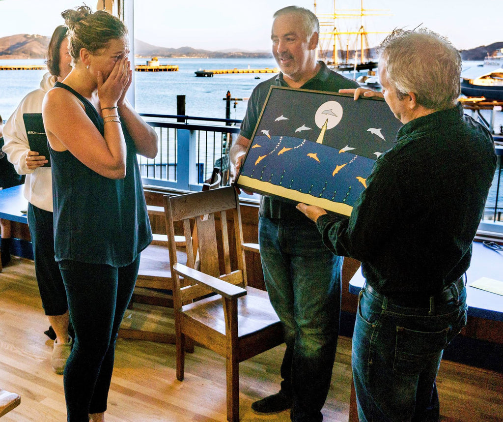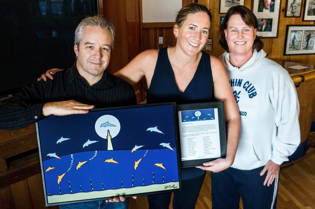 Michelle - Marin, United StatesDolphin Detour was a surprise gift from a dear friend who obviously knows me well. John's use of colors and technique brings his dolphin to life as they frolic in the Bay under the watchful eye of the Transamerica Pyramid. Beautiful piece that will be proudly displayed in my house for years to come and undoubtedly spark many conversations. Bravo, John!!!
